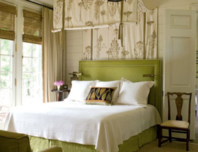 The walls in this room were painted an oatmeal color. The use of bright colors like lime green and orange as bedding accents works too. For any DIY person, note how the canopy is rolled and tied. How easy is that? What I really love is the floral canopy as it softens the room to give the entire effect an inviting and relaxing atmosphere. In fact, all the
